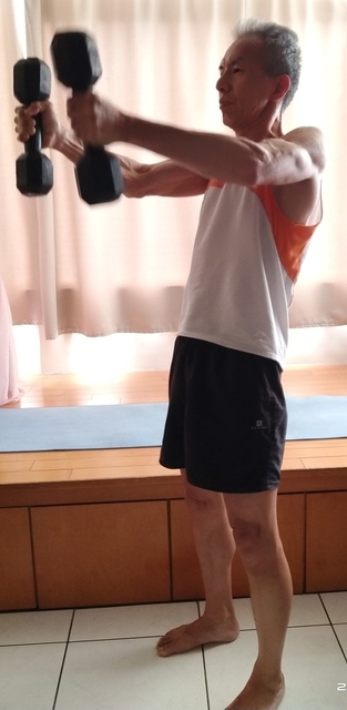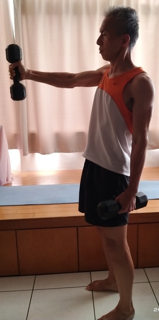 7.5Kg啞鈴單臂交互前舉各25下 / 雙臂同時平舉放下25次